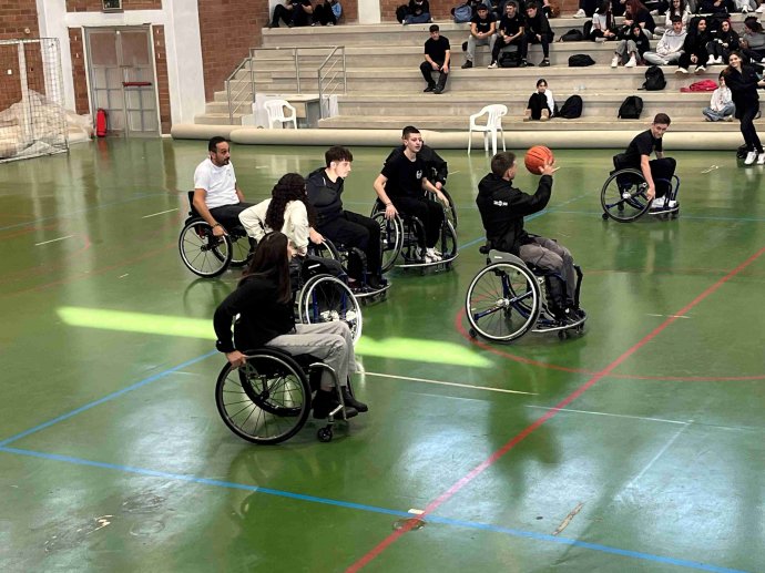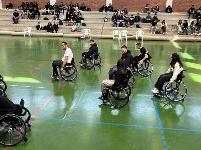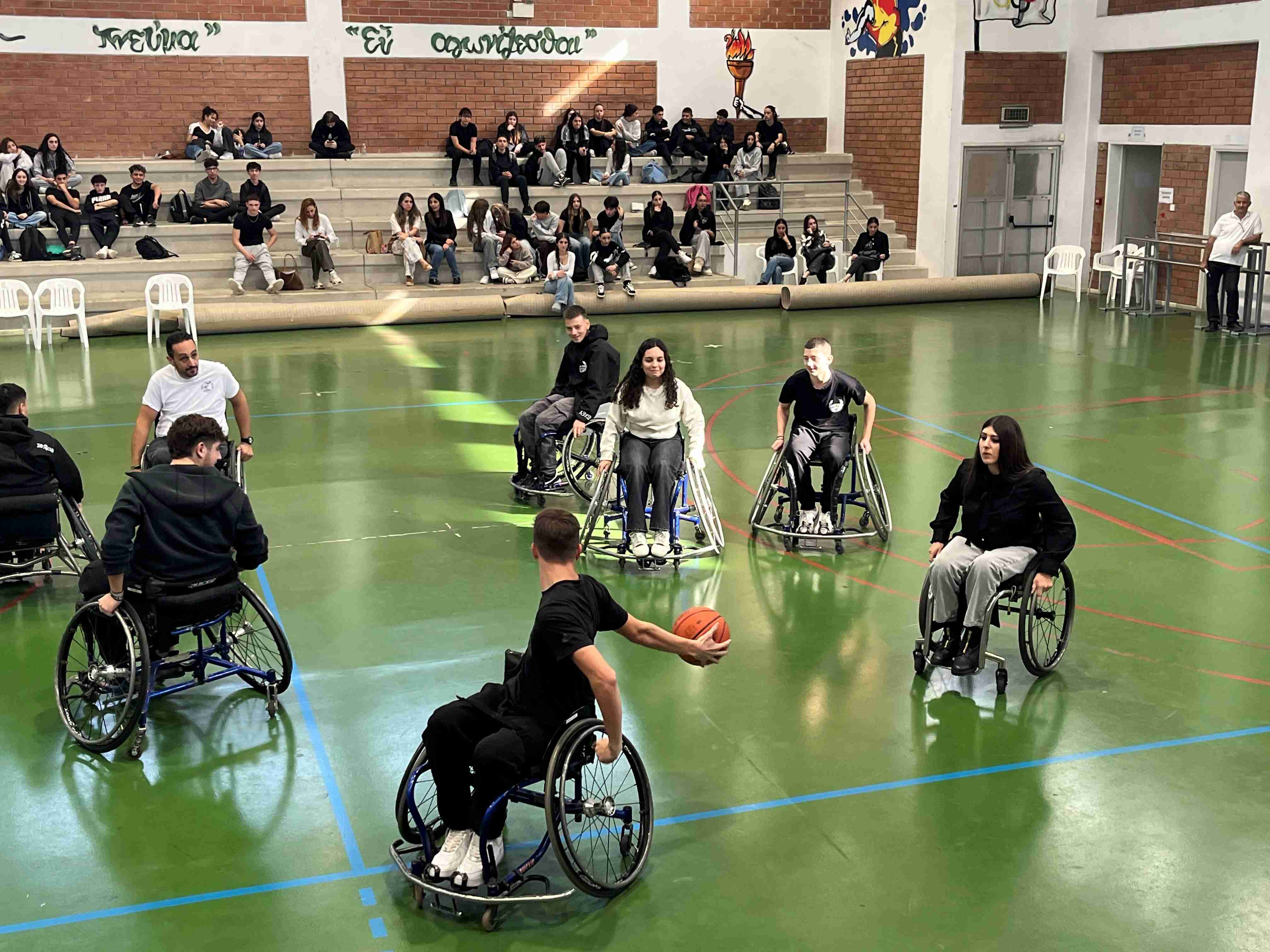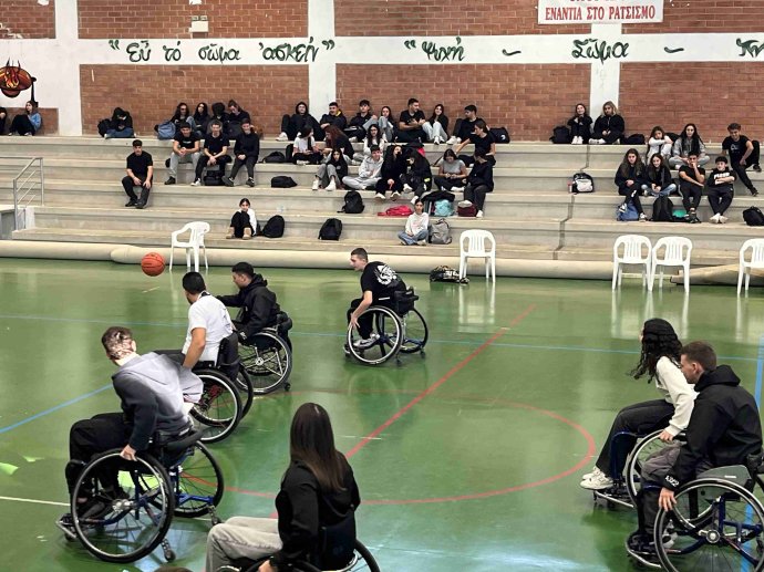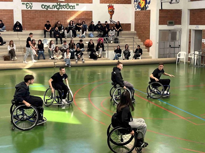 Στο δεύτερο μέρος της δράσης, οι μαθητές/τριες συμμετείχαν σε μια βιωματική δραστηριότητα με έντονο παιδαγωγικό χαρακτήρα. Συγκεκριμένα, έπαιξαν καλαθοσφαίριση με αμαξίδια, με στόχο να κατανοήσουν έμπρακτα τις δυσκολίες αλλά και τις δυνατότητες των ατόμων με κινητική αναπηρία. Η εμπειρία αυτή βοήθησε τους μαθητές να αναπτύξουν ενσυναίσθηση, σεβασμό και μεγαλύτερη κατανόηση για τη σημασία της προσβασιμότητας και της ισότιμης συμμετοχής στον αθλητισμό και στη ζωή γενικότερα.