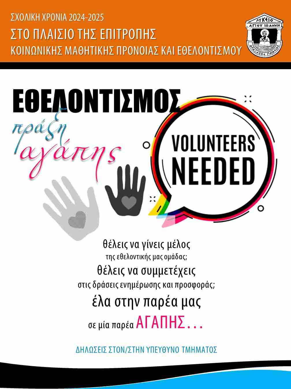 Για τρίτη συνεχή χρονιά το Σχολείο μας συμμετείχε στο πρόγραμμα «Νεολαία και Εθελοντισμός» που εφαρμόζεται για 20η χρονιά με πρωτοβουλία του Παγκύπριου Συντονιστικού Συμβουλίου Εθελοντισμού (ΠΣΣΕ). Στόχος του προγράμματος είναι η καλλιέργεια του πνεύματος του εθελοντισμού στις σχολικές μονάδες. Ακολούθως παρουσιάζονται οι κυριότερες δράσεις που υλοποιήσαμε στο πλαίσιο του προγράμματος.